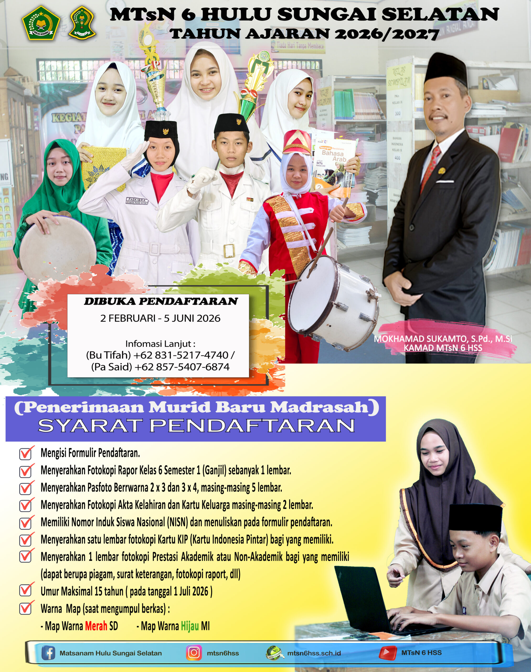 Assalam mu’alaikum wr. wb. Puji syukur senantiasa kita panjatkan ke hadirat Allah Swt., yang begitu banyak nikmat, karunia, dan rizki yang telah dilimpahkan-Nya, sehingga MTsN 6 Hulu Sungai Selatan dapat meluncurkan web ini. Shalawat dan salam semoga tetap terlimpahkan kepada Nabi junjungan kita Muhammad SAW. Semoga keteladanan dan sunnah-sunnah beliau senantiasa kita ikuti dalam segala niat, perkataan, dan perbuatan kita. Amin